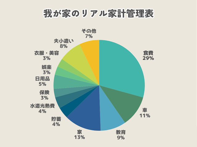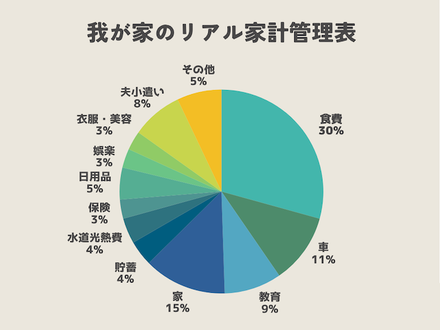 食費が全体の約3割、車の維持費が1割強、教育費が約1割。グラフにしてみると“どこにお金が流れているか”がひと目で分かりました。
